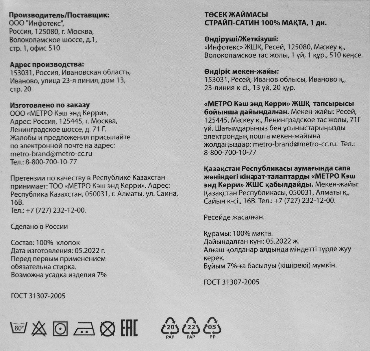 METRO PROFESSIONAL Пододеяльник сатин белый, 175 х 215 см можно приобрести для домашнего использования или для гостиниц, санаториев, домов отдыха и других предприятий. Сатиновый пододеяльник обеспечит комфортный сон. Он приятен на ощупь, обладает отличными гигроскопичными свойствами. Нейтральный белый цвет и орнамент делают постельную принадлежность универсальной. Она будет одинаково органично смотреться ��ак с белым, так и с разноцветным бельем. Пододеяльник изготовлен из полностью натурального материала – 100% хлопка. У ткани оптимальная плотность, она не толстая и не тонкая. Сатин практически не мнется. Его легко разгладить после стирки. Стирать изделие рекомендуется на деликатном режиме при температуре не выше 400С. Таким образом структура ткани не нарушается и долго сохраняет изначальный вид. При стирке используются соответствующие порошки или гели. Чтобы у постельного белья долго сохранялся приятный аромат применяют бальзамы-ополаскиватели. При должном уходе материал выдерживает многочисленные стирки и служит долгие годы.