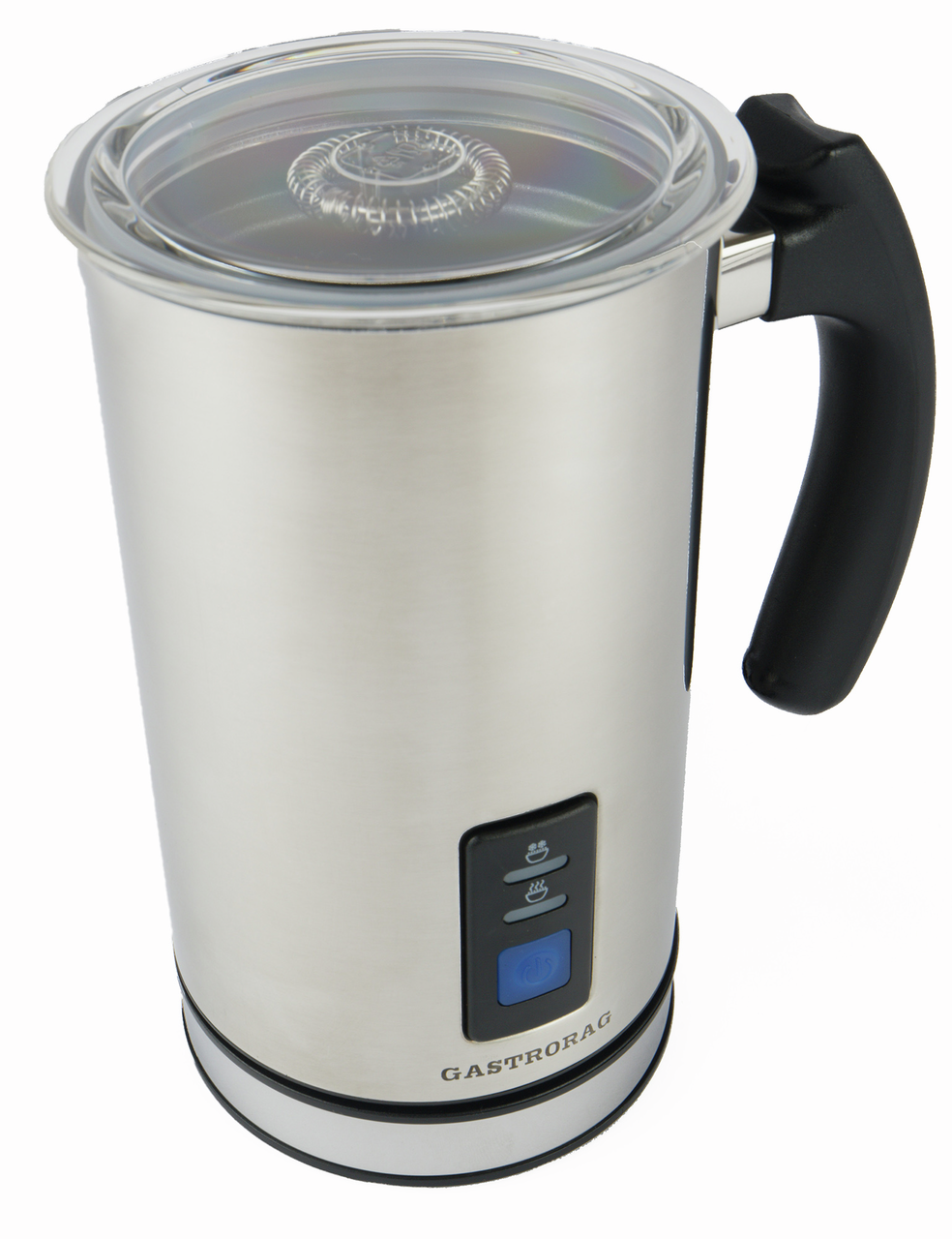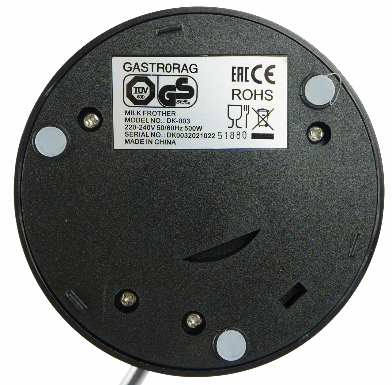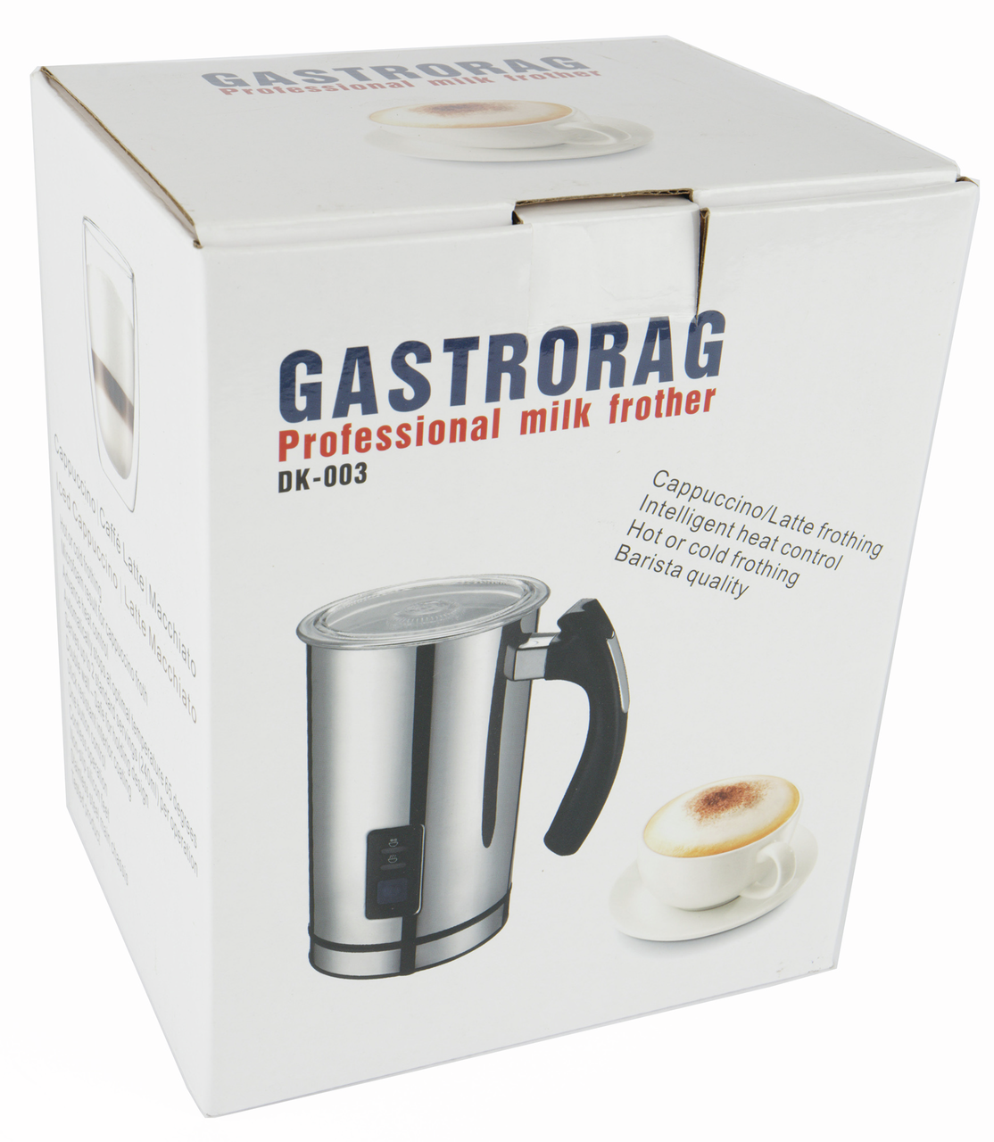 Вспениватель GASTRORAG DK-003 станет отличным выбором для любителей кофе. Вы сможете приготовить любимый напиток (например – латте или капучино) с наилучшим качеством. Модель, предназначенная для работы с молоком, имеет 3 режима работы – вспенивание (без нагрева), нагрев, а также вспенивание, совмещенное с нагревом. Максимально доступный объем для вспенивания – 115 мл. Максимальный объем для подогрева – 240 мл.Вспениватель-кувшин GASTRORAG DK-003 характеризуется потребляемой мощностью, равной 500 Вт. Имеется антипригарное внутреннее покрытие. Рабочая температура вспенивателя – 65 C. Контролировать процесс работы прибора очень легко: крышка вспенивателя прозрачна. Управление производится с помощью кнопочной панели. Панель управления интуитивно понятна. В комплектацию вспенивателя входят 2 мешалки.Ручка вспенивателя не подвержена нагреву. Подключение прибора к сети производится с помощью шнура с евровилкой. Цвет корпуса – серебристый. Диаметр и высота вспенивателя равны 103 и 183 мм соответственно. Масса прибора – 1150 г. Модель упакована в презентабельную коробку.