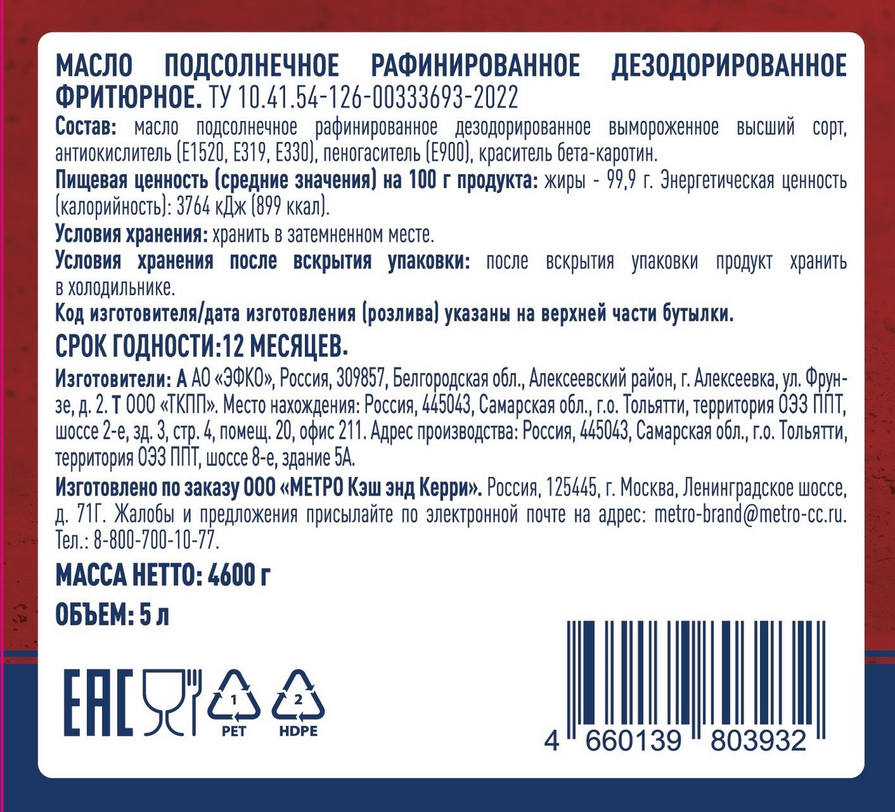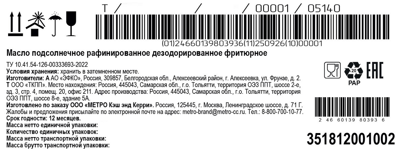 Подсолнечное масло рафинированное, окислитель, носитель Е1520.