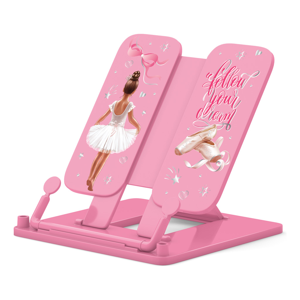 Складная подставка с фиксатором для книг. Позволяет расположить книгу под удобным углом наклона (7 углов). Держатель, расположенный в нижней части, надежно фиксирует страницы. Ширина подставки — 235мм, высота спинки — 190мм.