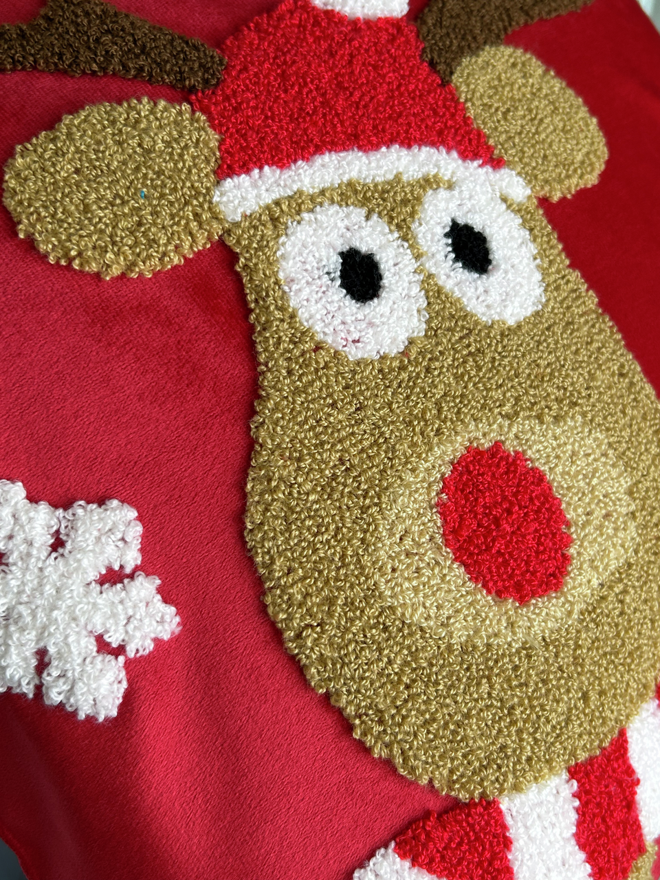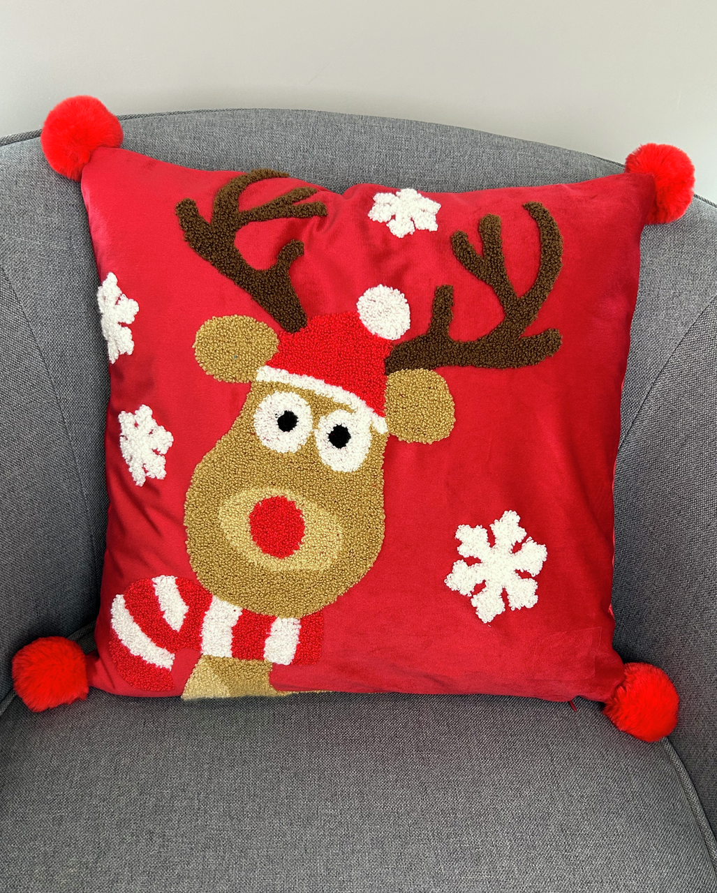 Подушка декоративная на молнии, размер 45*45см. Съемный чехол выполнен из бархата молочного цвета с объемной ковровой вышивкой на лицевой стороне, выполненной в виде Оленя и снежинок. На углах подушки вшиты меховые помпоны. станет прекрасным дополнением к любому интерьеру. Будет элегантным дополнением к интерьеру в стиле неоклассика, привнесет в помещение уют и смягчит строгий дизайн. Ее удобно подкладывать под голову или спину, чтобы принять комфортную позу во время отдыха. Для пошива использован плотный полиэстер. Ткань приятная на ощупь, не мнется, не впитывает влагу.