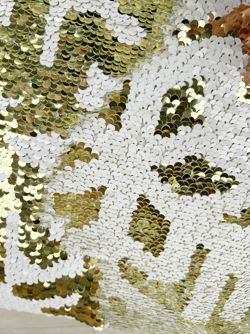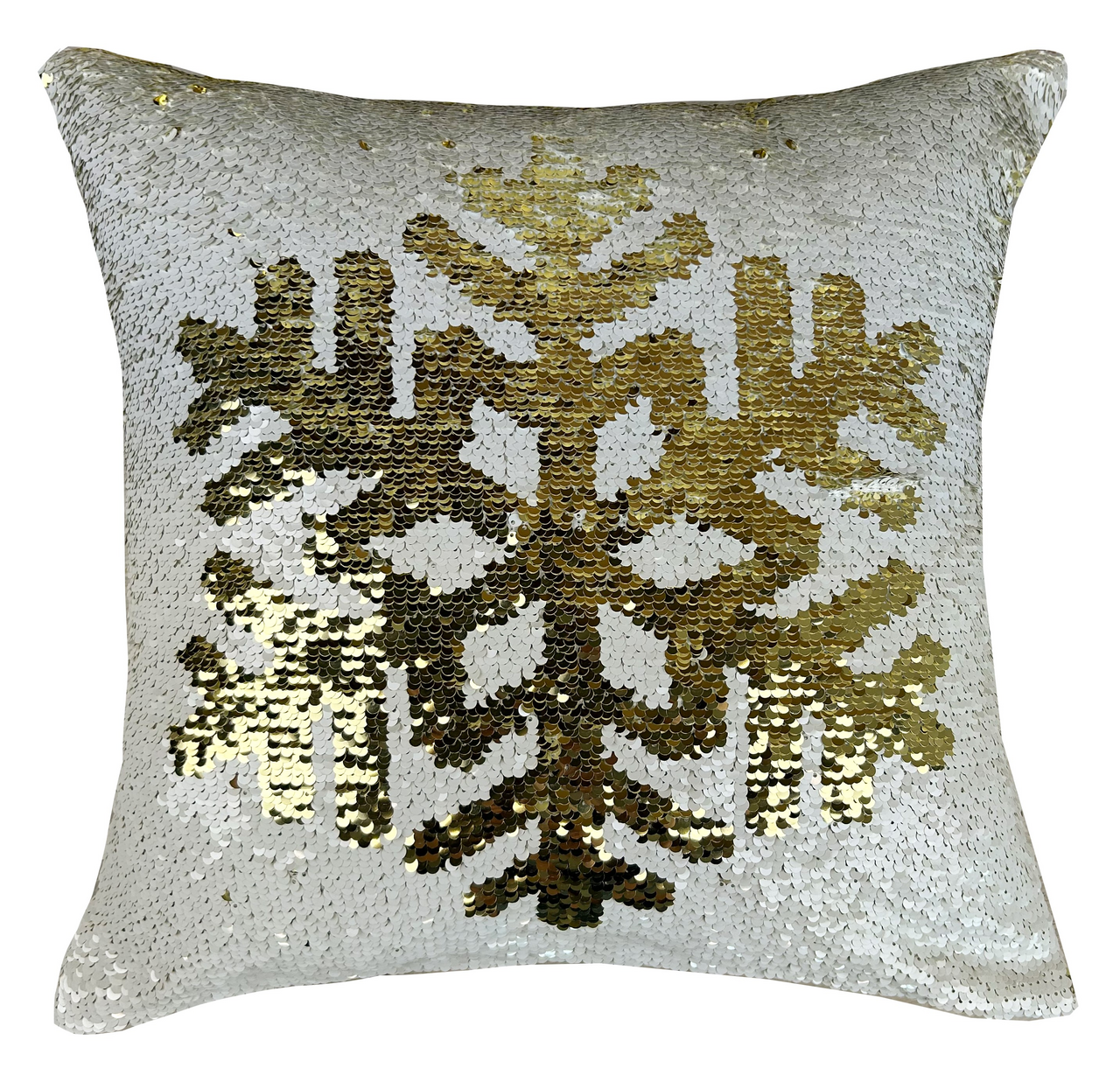 Подушка декоративная на молнии, размер 45*45см. Съемный чехол выполнен тафты. Лицевая часть наволочки полностью вышита двусторонними пайетками с рисунком, выполненным в виде Снежинки. Можно поменять цвет рисунка с белого на золотой и обратно. Благодаря создающей фактуру термоскрепленной стежке имеет лаконичный дизайн и идеально подходит для украшения кровати или дивана в любом интерьере.