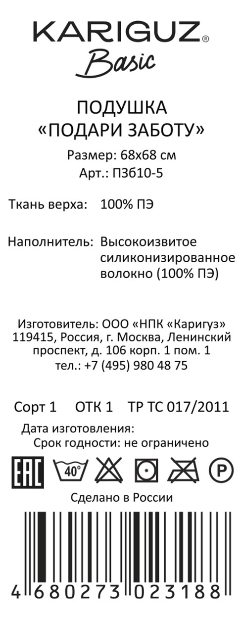 Подушка Kariguz Подари заботу полиэфирное волокно, 68 х 68см