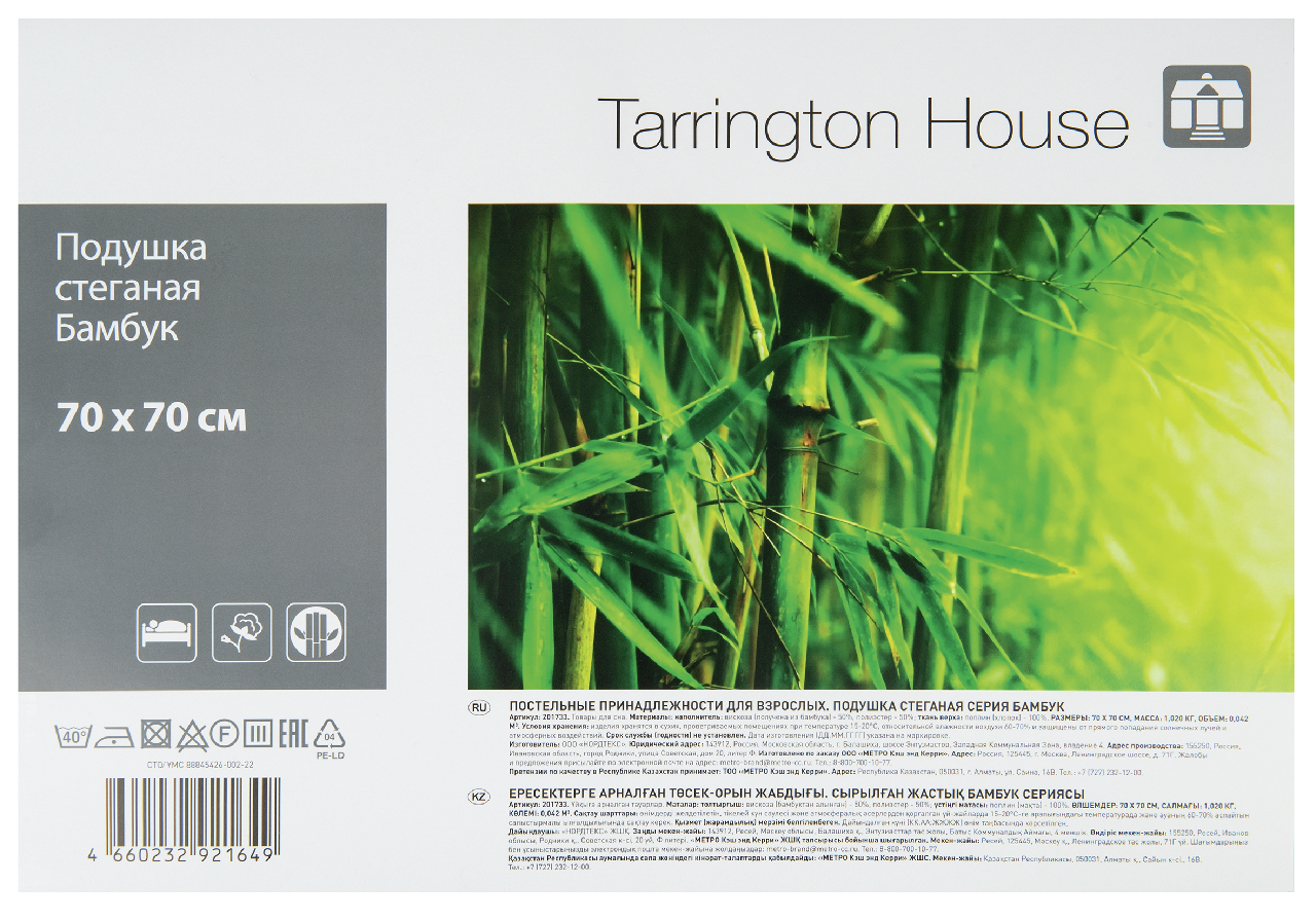Tarrington House Подушка полиэстер 100% серия бамбук, 70x70 см — идеальный вариант для полноценного сна и качественного отдыха. Основные преимущества: — Поддержка. Плотный наполнитель обеспечивает поддержку головы и шеи, повышая комфорт сна и позволяя избежать неприятных ощущений в шее. — Оптимальный размер. Прямоугольная подушка в размере 70 на 70 сантиметров является идеальным вариантом для сна. — Простота ухода. Чтобы подушка радовала на протяжении многих лет, ее примерно два или три раза в год необходимо отдавать в химчистку. При желании за ней можно ухаживать самостоятельно, время от времени стирая ее в машинке. — Мягкость. Подушка мягкая, но в то же время достаточно упругая. Она подходит для комфортного сна как на боку, так и на спине. — Пропускает воздух. Отдыхать на подушке максимально комфортно как в жару, так и в холодное время года. Она хорошо пропускает воздух и обладает достойными гигроскопическими характеристиками: впитывает влагу и отводит ее. Подушка бренда Tarrington House из серии Бамбук — лучший вариант для дома и дачи. Благодаря ей можно забыть о проблемах со сном и боли в шее. Несмотря на мягкость, она очень быстро возвращается в свою форму.
