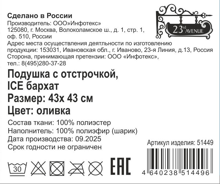 Подушка декоративная 23rd Avenue Ice Бархат оливковая, 43 x 43см