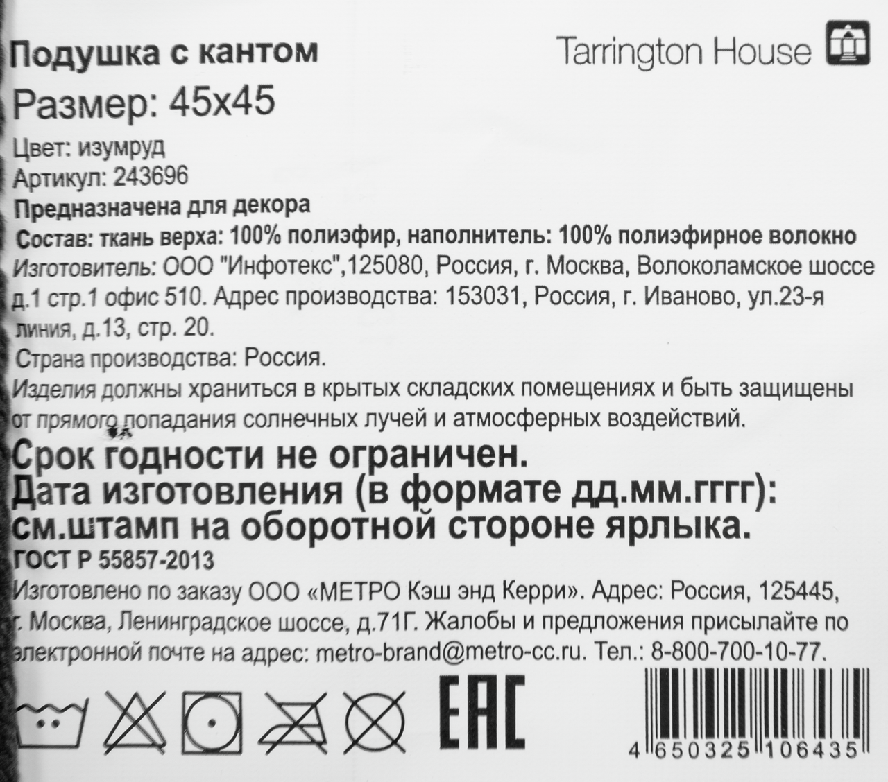 Tarrington House Подушка декоративная изумрудная с кантом, 45 x 45см при производстве подушки используется качественный наполнитель, благодаря которому изделие хорошо сохраняет форму.