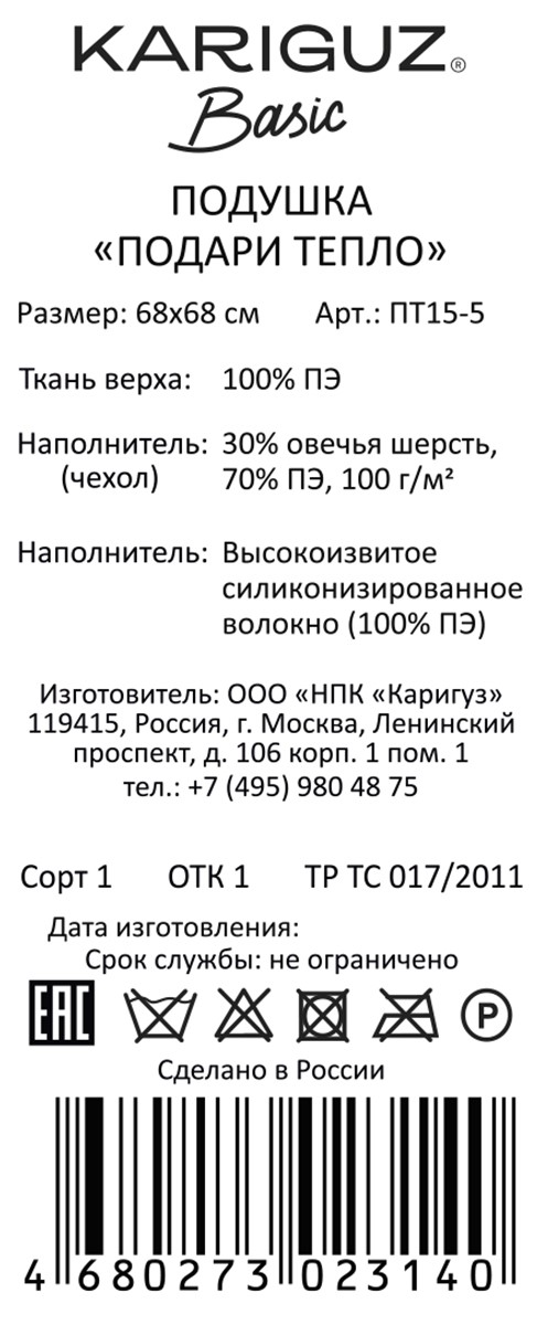 Подушка Kariguz Подари тепло овечья шерсть, 68 х 68 см наполнена шерстью. Этот материал обладает высокой теплопроводностью и достойными гигроскопичными характеристиками. В состав наполнителя вошли и полиэфирные волокна. Многочисленные исследования показали, что малая их концентрация в составе никак не влияет на положительные свойства шерстяного наполнителя. Подушки с чехлом из шерсти долговечны и максимально комфортны.