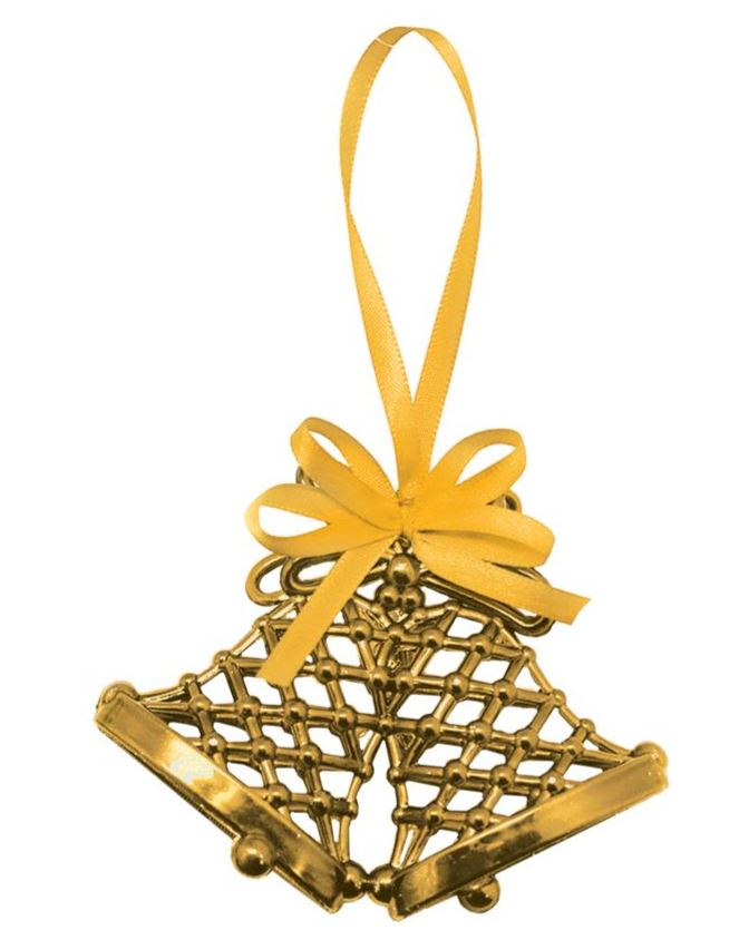 Подвеску колокольчики золото можно использовать как елочную игрушку. Она станет достойным украшением рождественского венка или еловой ветки. Колокольчики считаются символом Рождества и Нового года. Они могут служить самостоятельным элементом декора. Их можно повесить в проеме двери или на окно. Они будут отлично сочетаться с яркой праздничной мишурой. Представленная модель не цельная, а резная, поэтому выглядят очень хрупкой и изящной. При этом она изготовлена из прочного материала. Подвеска покрыта золотой краской. Сверху имеется колечко. Сквозь него пропущена тонкая ленточка, из которой сделали несколько бантиков.