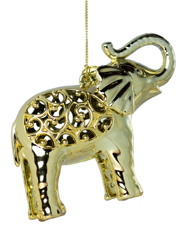 Новогодняя игрушка в форме слона станет оригинальным украшением ели и разбавит атмосферу нотками экзотики. Благородное создание будет интересно смотреться среди хвойных ветвей и выделяться среди других коллекций елочных игрушек. Украшение выполнено в золотом цвете, который является классическим новогодним оттенком. Каждое подвесное украшение идет в индивидуальной упаковке, поэтому послужит отличным подарком для ваших близких.