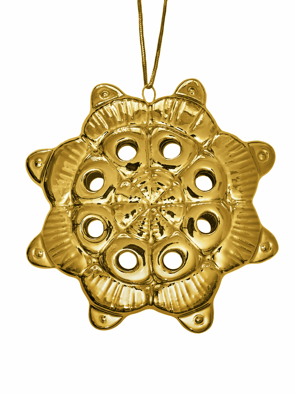 Золотая новогодняя елочная игрушка украсит любую елку и сделает ее великолепной и сияющей. Форма подвесного украшения в виде звезды идеально впишется в разные стили оформления. Елочная игрушка выполнена из фарфора, покрытого золотой глазурью, которая красиво отражает свет и волшебно переливается в лучах гирлянд. Такая новогодняя игрушка будет великолепным вариантом сувенира на зимние праздники, поэтому купить ее можно в качестве самостоятельного подарка или дополнения к основному презенту. Звездочка достаточно большая: ее размер составляет 8 см. В качестве подвеса используется золотой шнур.