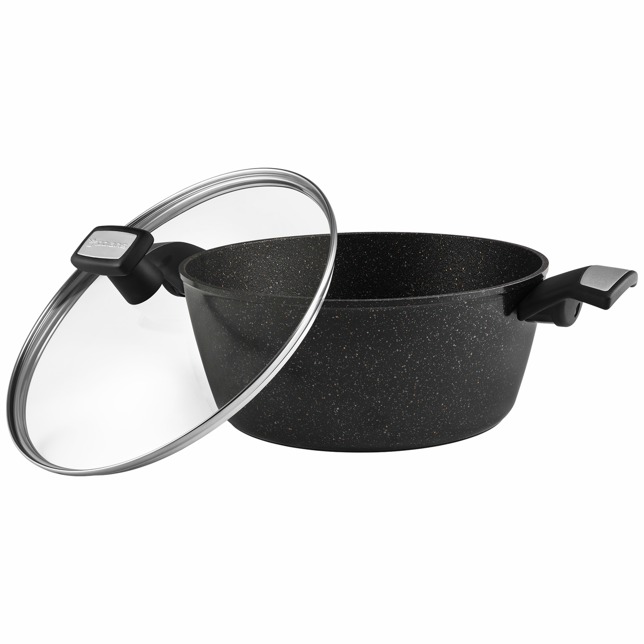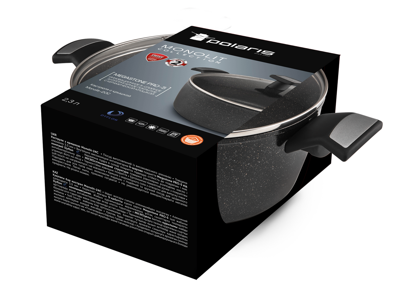 Кастрюля с крышкой Polaris Monolit 20C кованый алюминий, 2,3 л, 20 см — незаменимый инвентарь на каждой кухне. Она имеет инновационное антипригарное 5-слойное покрытие, которое демонстрирует высокую прочность. В его составе – керамическая крошка. Покрытие кастрюли — термостойкое. Структура поверхности равномерно распределяет масло и удерживает его на месте. Изделие оснащено эргономичными бакелитовыми ручками с покрытием Soft Touch. Крышка производится жаропрочного стекла, для выпуска пара на ней имеется специальное отверстие. Кастрюля подходит для всех типов плит, включая индукцию.