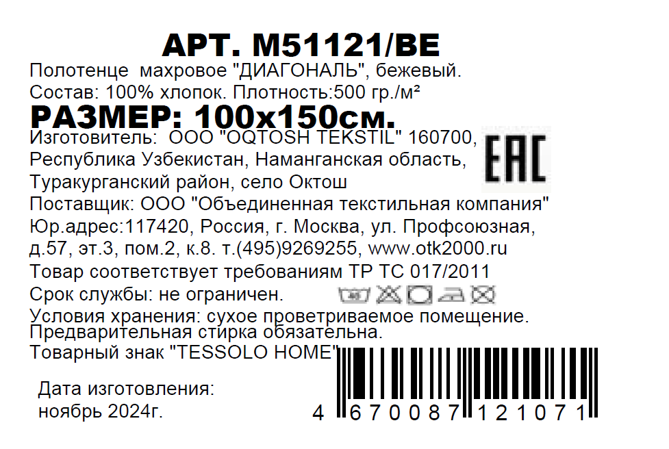 Полотенце Tessolo Home махровое диагональ бежевое, 100 x 150см