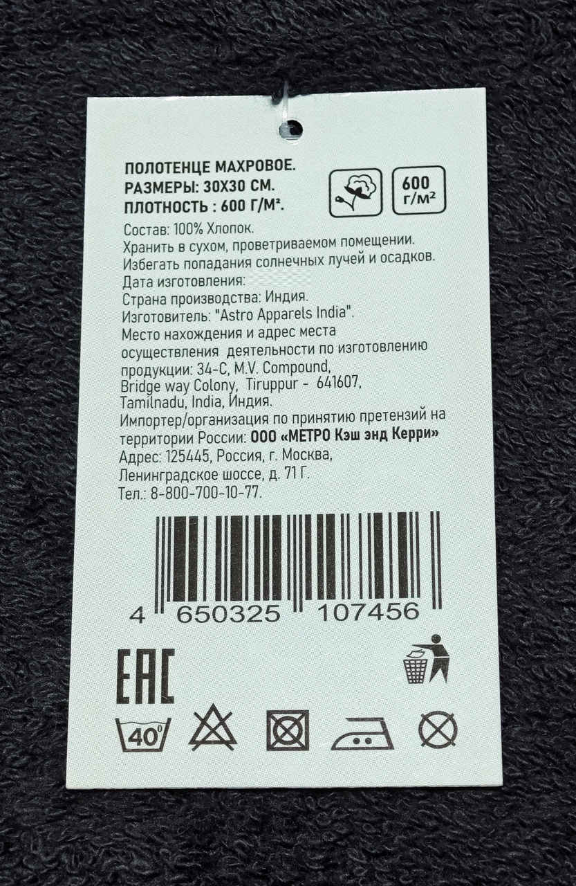 METRO PROFESSIONAL Полотенце махровое антрацит хлопок 600 г/м2, 30 х 30см