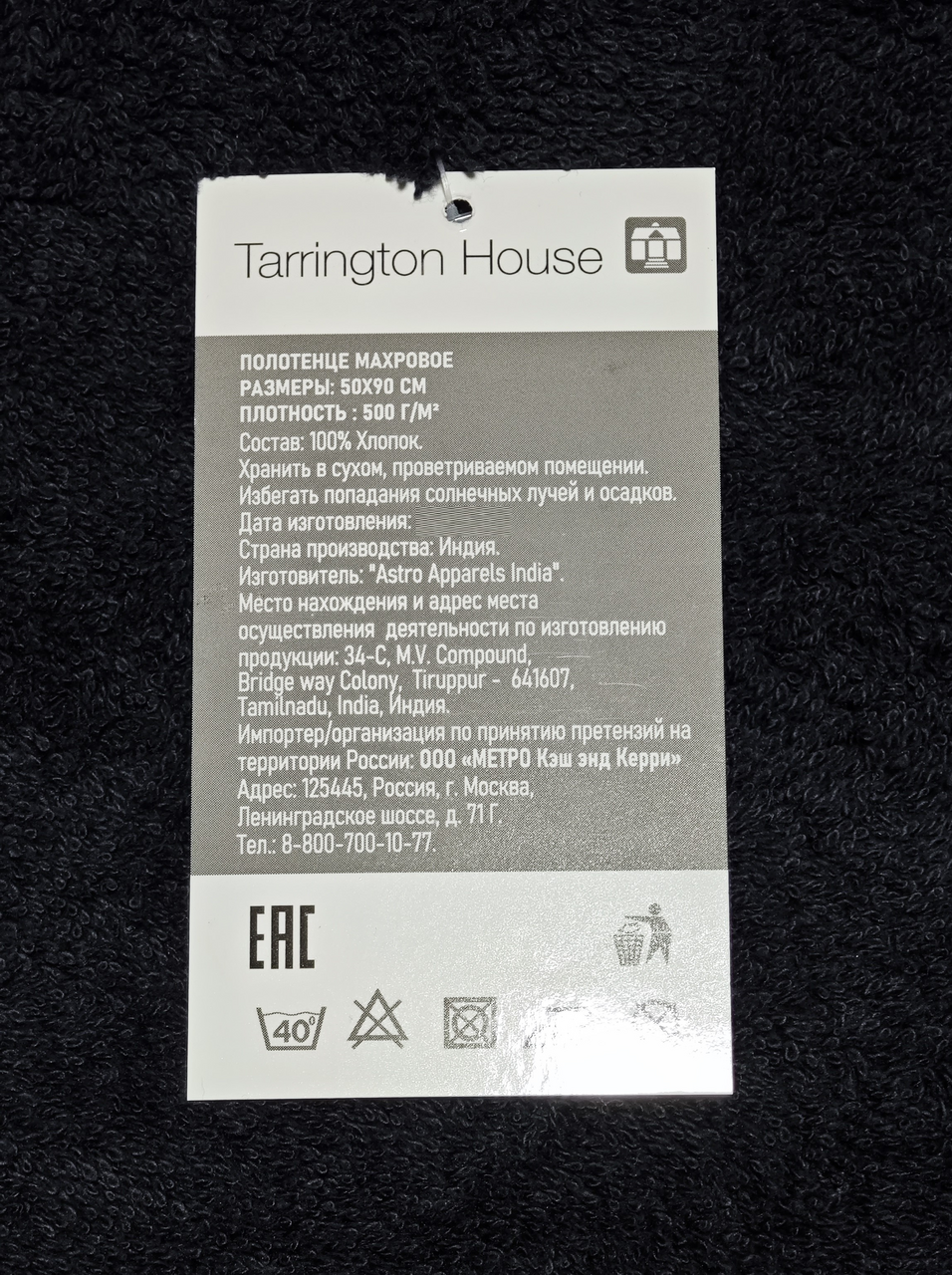 Tarrington House Полотенце хлопок антрацит махровое 500 г/м2, 50 х 90см