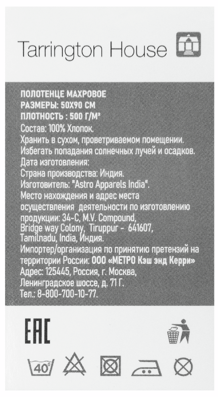 Tarrington House Полотенце хлопок бежевое махровое 500 г/м2, 50 х 90см