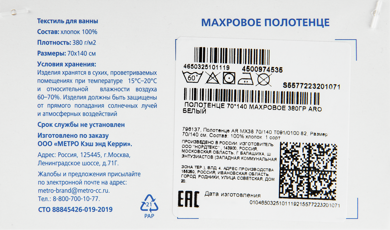 aro Полотенце махровое белое 380г, 70 x 140г