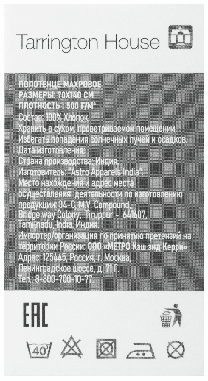 Tarrington House Полотенце хлопок бежевое махровое 500 г/м2, 70 х 140см