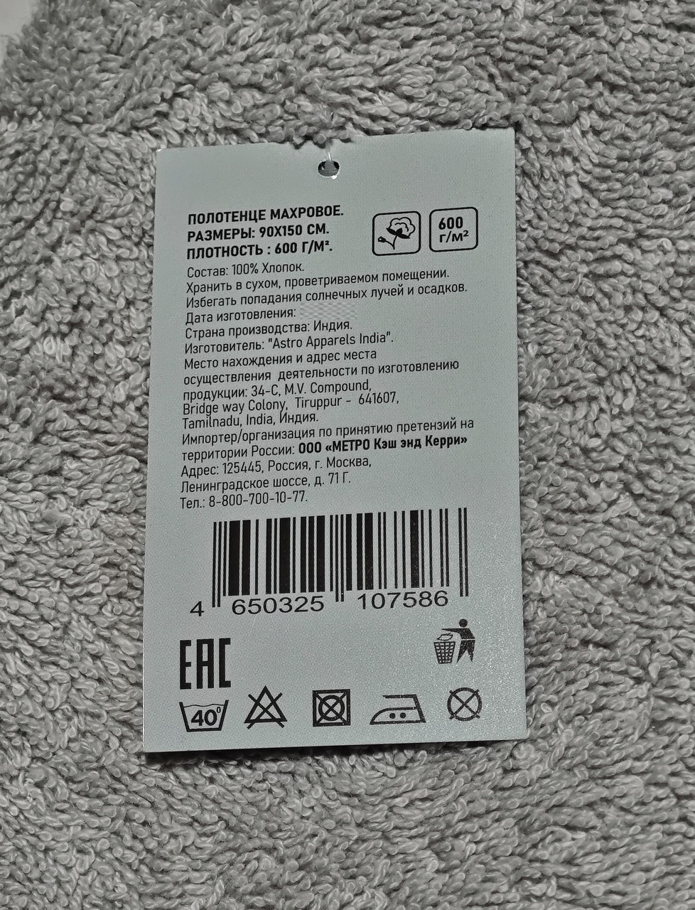METRO PROFESSIONAL Полотенце махровое серое хлопок 600 г/м2, 90 х 150см