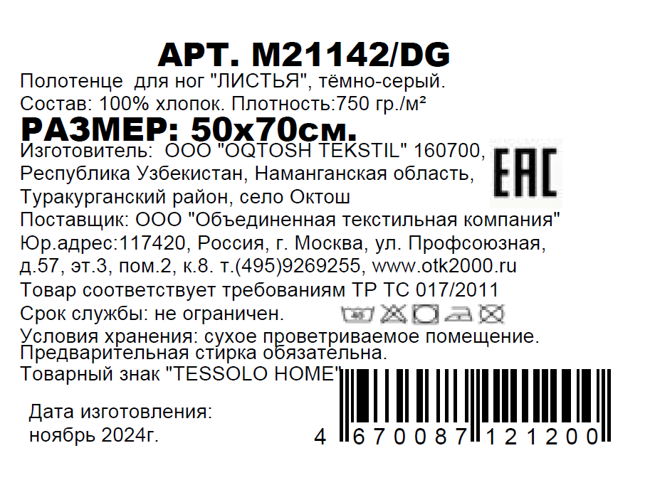 Полотенце махровое из 100% хлопка (плотность 750г/м2). Это махровое полотенце, изготовленное из 100% натурального хлопка. Оно не только красиво украшено рельефным узором камешки, но и имеет приятный цвет. Но главное, что делает это полотенце особенным, это его мягкий ворс и высокая плотность, которые обеспечивают отличное впитывание влаги и быструю сушку.