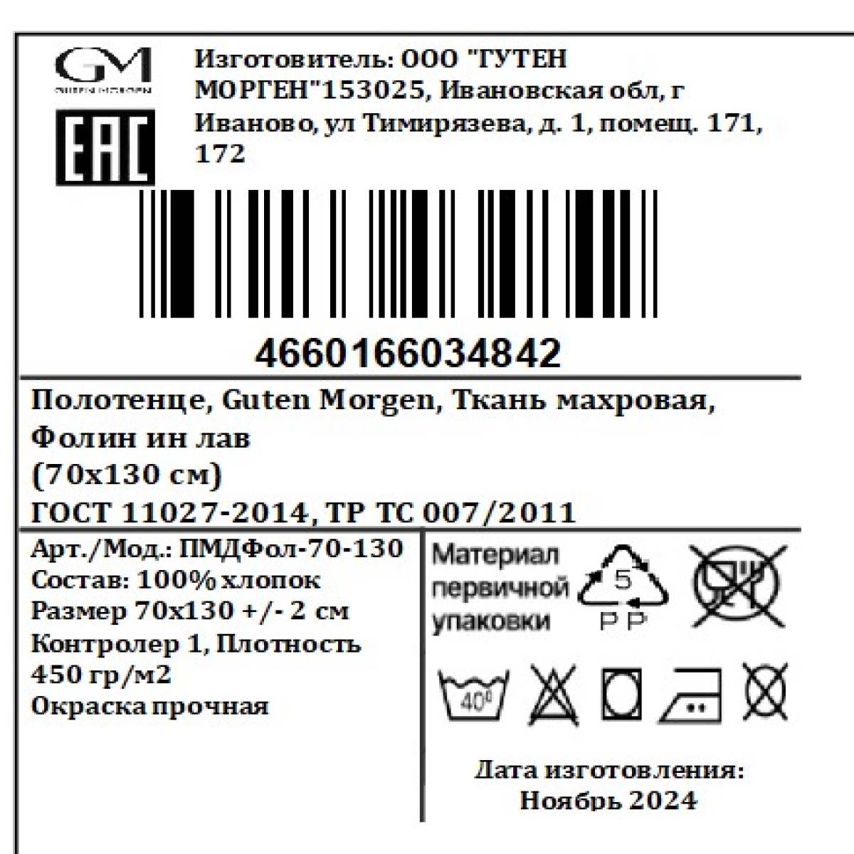 - Размер полотенца, см 70 х 130