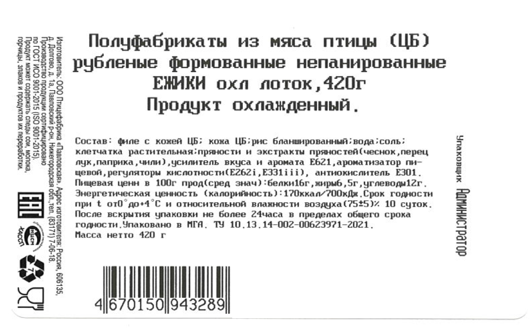 Ежики из цыпленка-бройлера Павловская курочка охлажденные, 420г