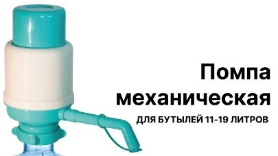 Помпа для воды, предназначена для розлива питьевой воды путем нажатия на верхнюю часть помпы (кнопку) вручную из стандартных 19-ти литровых бутылей с зажимным кольцом. Помпа обладает оптимальным усилием нажатия для наливания воды. Гофра помпы выполнена из полиэтилена с увеличенной толщиной стенки, что придает ей долговечность и эластичность. Снабжена регулируемой трубкой забора воды.