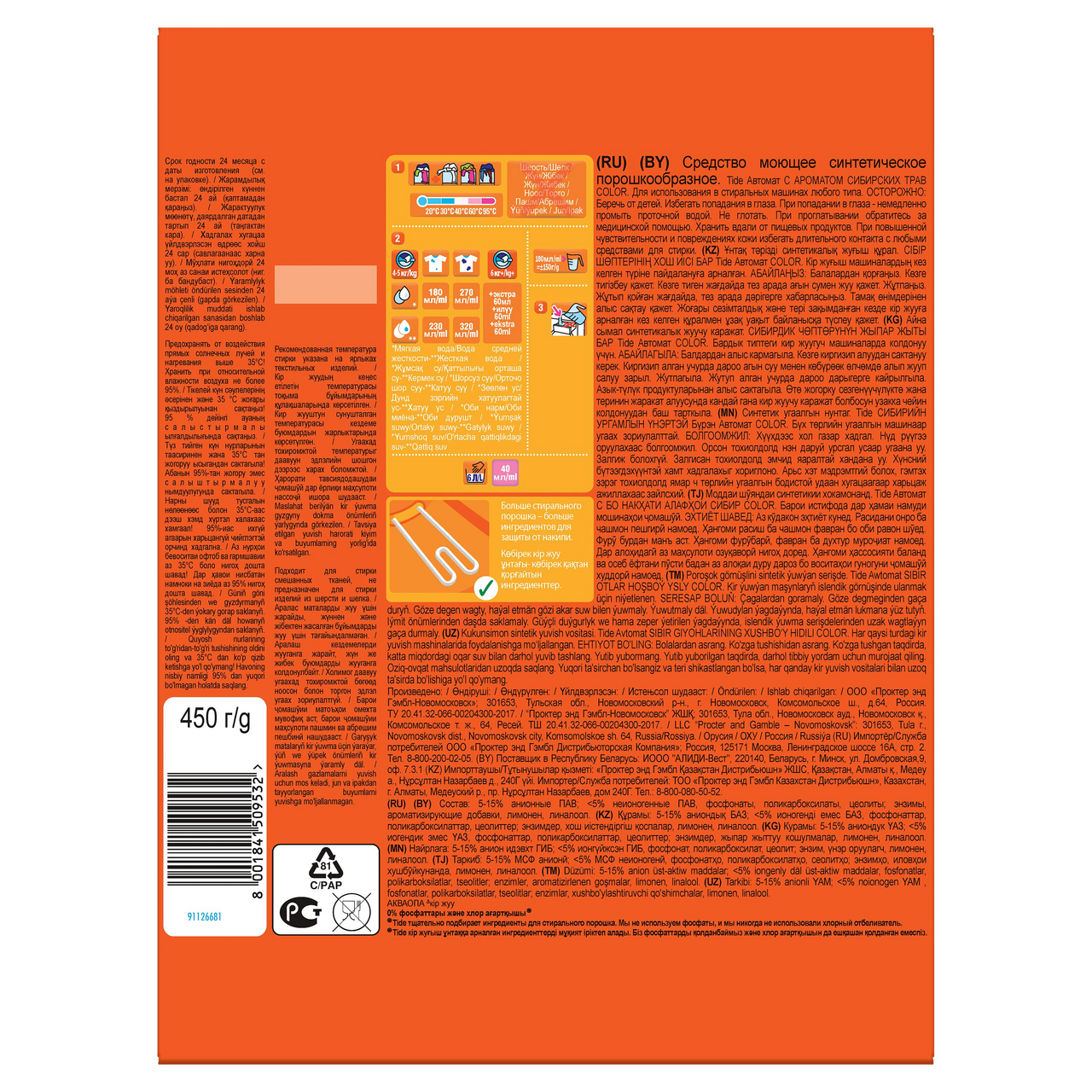Стиральный Порошок Tide Сибирские Травы Color сочетает в себе безупречное очищение от Tide и великолепное сохранение цвета стирка за стиркой с мягким ароматом, навеянным природой России. Tide тщательно подбирает ингредиенты для своих средств.Стиральный порошок для безупречного очищения и сохранения цвета от TideМягкий аромат, навеянный природой РоссииНе содержит фосфатов и хлорного отбеливателяСпециальная форм��ла не оставляет разводов