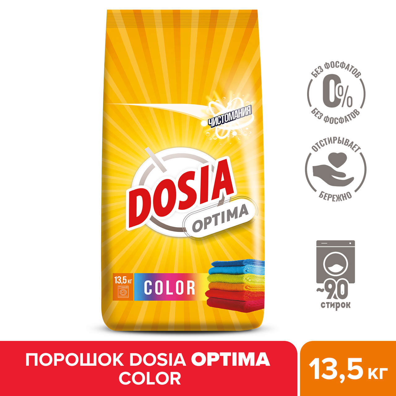Порошок стиральный Dosia Optima Color, 13.5кг справится с различными загрязнениями и придаст белью неповторимую свежесть. Благодаря оптимальной формуле для повседневной стирки порошок Dosia прекрасно справляется с различными пятнами, отстирывает бережно и эффективно, не повреждая волокна ткани. Придает белью приятную свежесть. Специально разработанная формула содержит компоненты для эффективного отбеливания, не содержит фосфаты и хлорные отбеливатели. Универсальный стиральный порошок идеально подходит для ручной и машинной стирки.