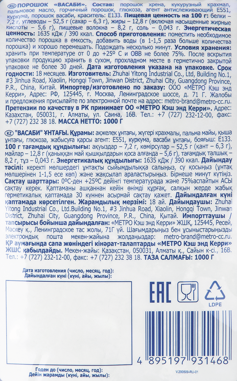 Metro Chef Порошок васаби, 1кг – острая восточная приправа из тертого корня японского хрена. Используется как добавка к блюдам национальной кухни в разных сочетаниях с пряностями, соусами и маслом для смягчения горячего резкого вкуса. Приправу в виде порошка нужно развести вместе с небольшим количеством кукурузного сиропа, масла или другой жидкости. По вкусу также кладется сахар, соль и лимонная кислота, по возможности – лецитин и кукурузный крахмал. После разведения готовую пасту можно употреблять с суши и другими традиционными блюдами. Васаби можно найти только в японской кухне. В свежем виде васаби найти не так-то просто, поэтому в основном он используется в виде пасты или порошка. Применять васаби следует в небольших количествах, так как он обладает чрезвычайно острым вкусом.