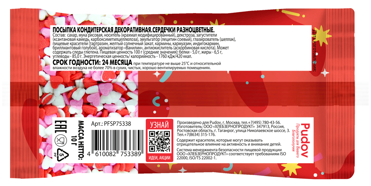 Посыпка С.Пудовъ сердечки разноцветная, 10г