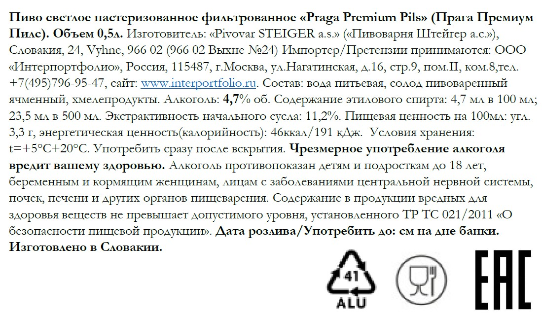 Пиво Praga Premium Imported, 0,5л насыщенного янтарно-золотистого цвета обладает приятным хлебным вкусом, оттеняет который нотки ореха. Аромат пива ненавязчивый, но раскрывающийся выразительным букетом. В нем объединяются запахи свежего хлеба и фруктов. Напиток бутилируется в стеклянную тару, оптимально сохраняющую его характеристики на протяжении всего срока хранения. Темное стекло защищает. Пиво от контакта с солнечными лучами, а герметичн�� закупоренная крышка предупреждает потерю естественной газированности. Пиво хорошо утоляет жажду, может подаваться как аперитив или дижестив. В качестве гастрономических сочетаний к нему подойдут морепродукты, вяленая рыба, копченая свинина или говядина, снеки, а также горячие мясные блюда.