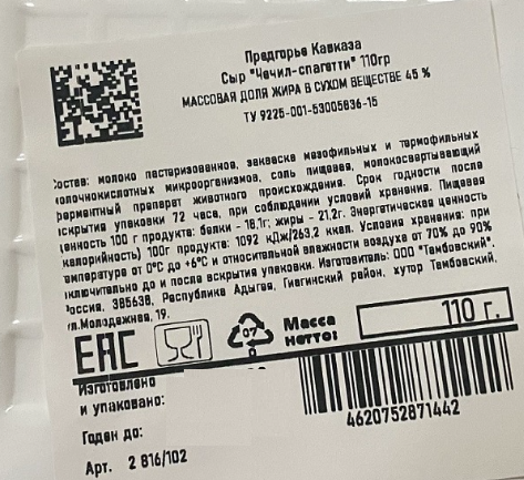 Сыр Предгорье Кавказа Чечил-спагетти 45%, 110г