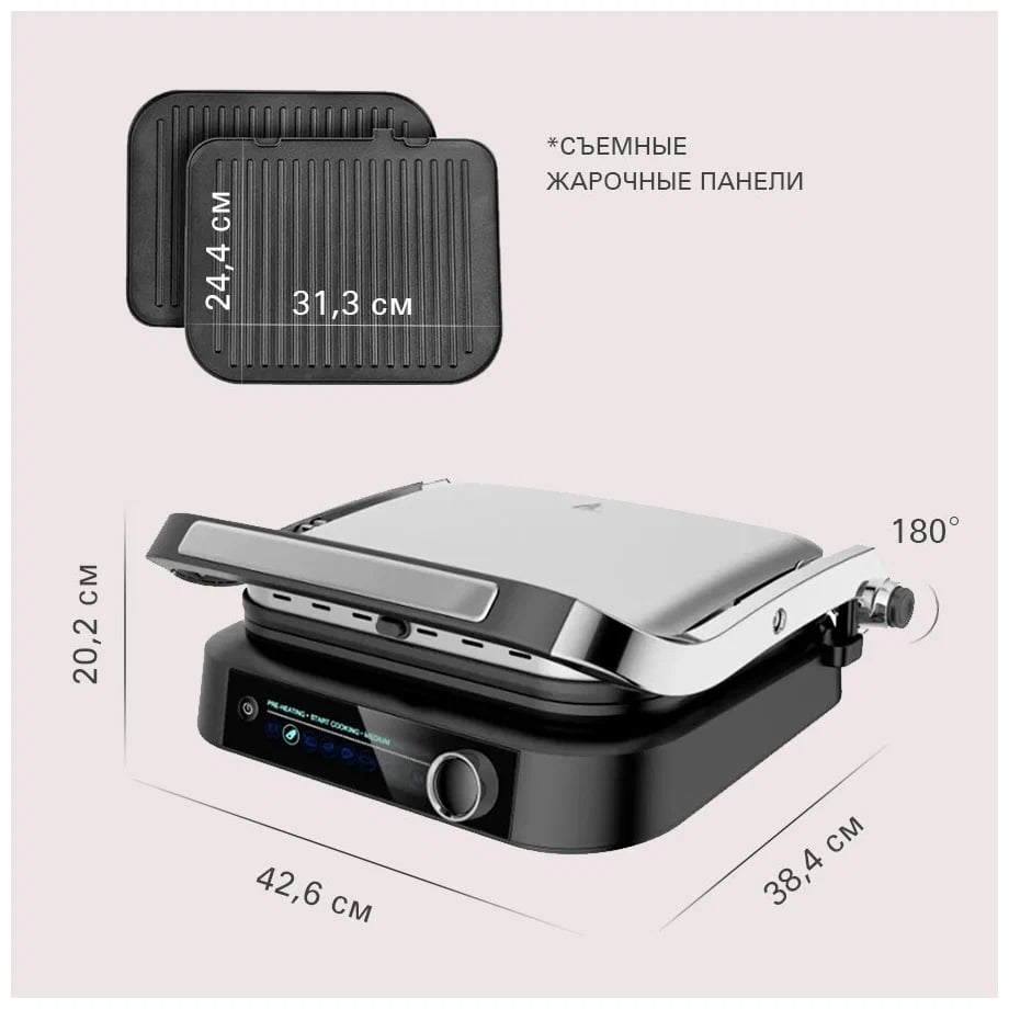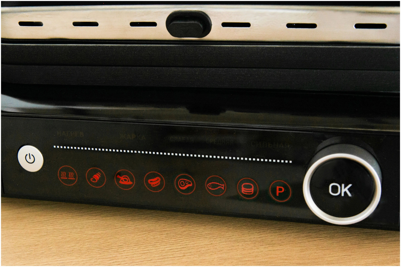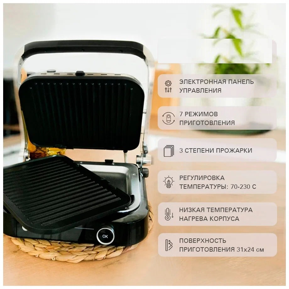 Пресс-гриль Gemlux GL-CG500 поможет приготовить самые разные блюда. На нем жарят вкусные стейки, сосиски и овощи, любимые бургеры, рыбу и птицу и т. д. Его можно использовать в домашних условиях или в небольших кафе, барах и других заведениях общественного питания. С этой моделью приготовление мяса занимает минимум времени. Подготовленные продукты просто выкладываются на пластины. После этого включается нужный температурный режим. Для приготовления не требуется масло. Благодаря антипригарному покрытию кусочки пищи не остаются на пластинах. Излишки жира, вытопленные из мяса, стекают по специальным желобкам в поддоны. Все детали легко очищаются после окончания работы. Съемные панели можно мыть под проточной водой (холодной или горячей) или в посудомоечной машине. Нагревающие элементы расположены под верхней и нижней пластиной. Это позволяет продуктам прожариваться равномерно. Готовить можно под прессом (им служит крышка прибора) или открытым способом. Мощности электрогриля достаточно, чтобы любой продукт приготовился быстро. Габариты рабочей поверхности позволяют жарить несколько порций одновременно. В приборе имеется 1 ручной и 7 автоматических режимов. В зависимости от продуктов выбирается бургеры, бекон, курица, рыба, свинина, стейк из говядины или размораживание. Степень прожарки говядины регулируется (RARE, MEDIUM или WELL DONE).