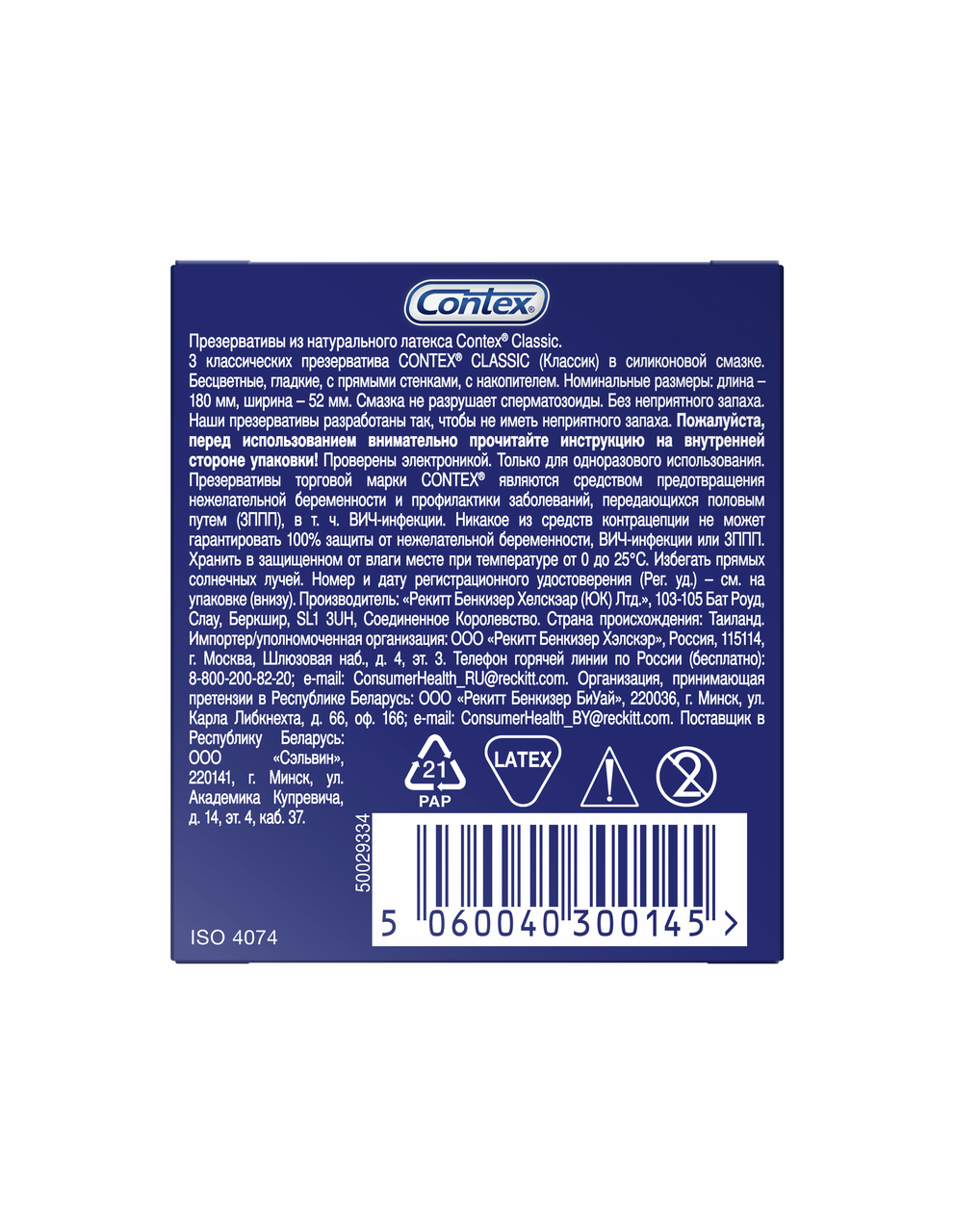 Презервативы Сontex "Classic" в силиконовой смазке с накопителем. Силиконовая смазка позволяет сохранить естественность природных ощущений. Сontex "Classic" - это, прежде всего, стиль жизни и взаимоотношений. Простота и элегантность, прочность и эластичность, комфорт и защита - вот то, что является отличительной чертой Contex. Вы спокойны, уравновешены, любите активный отдых и неизменно заботитесь о себе и любимом человеке.