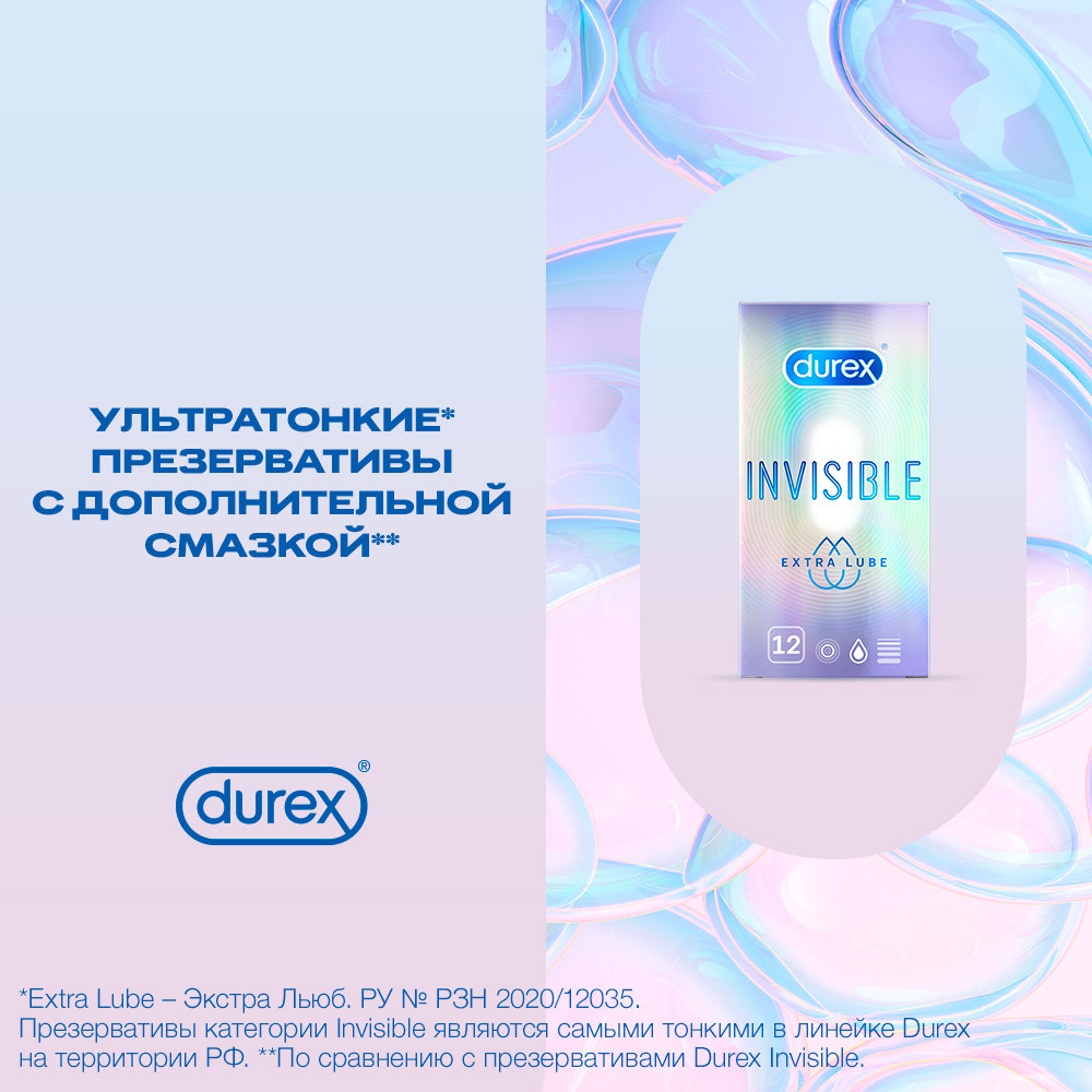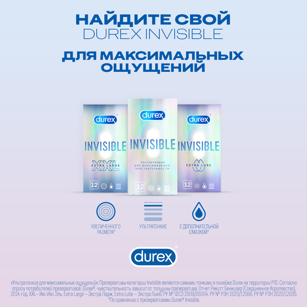 Ультратонкие презервативы Durex Invisible Extra Lube созданы для того, чтобы увеличивать чувствительность, в то же время предоставляя высокие стандарты качества. Durex Invisible Extra Lube содержат на 20% больше смазки по сравнению с презервативами Durex Invisible.