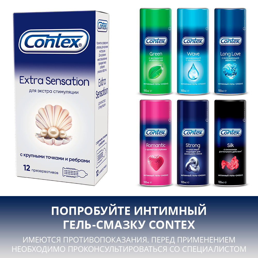 Презервативы Сontex "Extra Sensation" 12 шт. - с крупными точками и ребрами. 12 презервативов Contex Extra Sensation (Экстра Сенсейшен) с более крупными точками и ребрами для экстра стимуляции. Бесцветные, анатомической формы, в силиконовой смазке, с накопителем.
