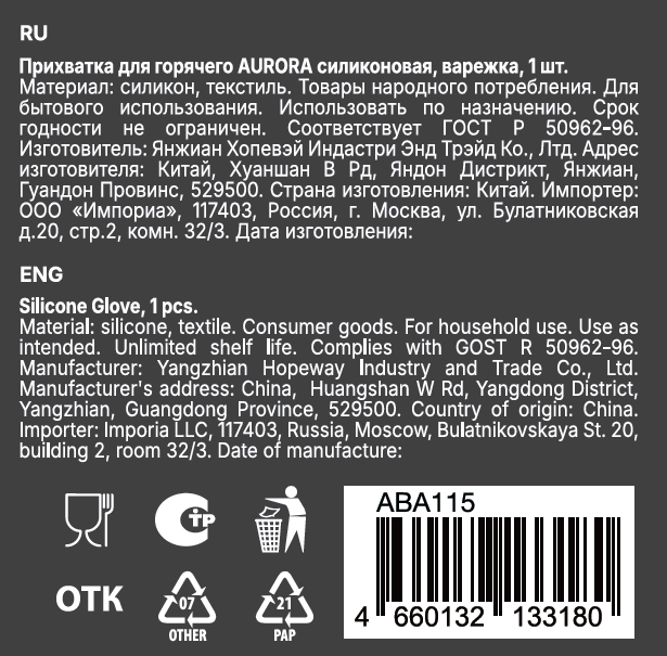 Прихватка для горячего AURORA силиконовая, варежка позволяет избежать неприятных ощущений и ожогов при работе с горячими предметами, поэтому отличается практичностью. Благодаря эргономичному дизайну удобна в использовании. Варежка-прихватка имеет компактные размеры, за счет чего не занимает много места.