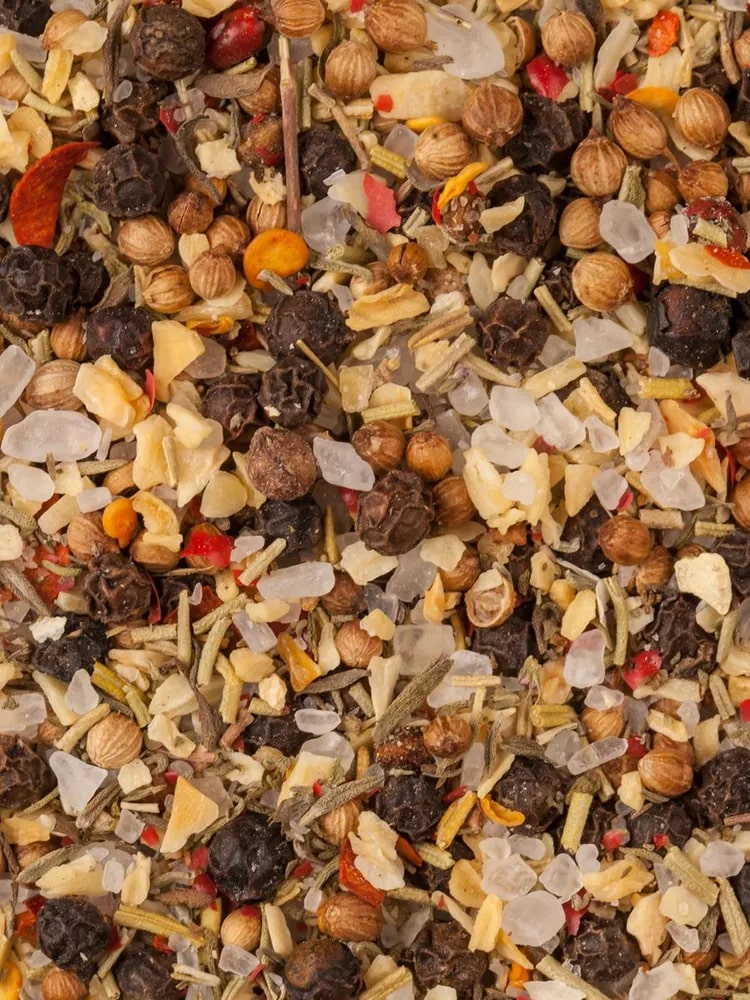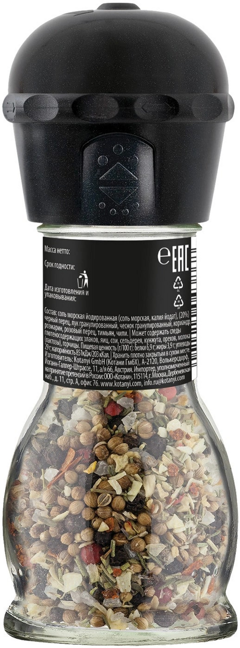 Соль морская йодированная (соль, калия йодат), (20%) черный перец, лук гранулированный, чеснок гранулированный, кориандр, розмарин, розовый перец, тимьян, чили.