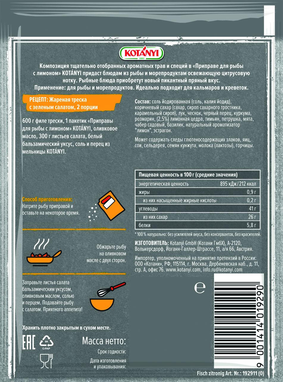 Соль йодированная (соль, калия йодид), коричневый сахар (сахар, сироп сахарного тростника, карамельный сахарный сироп), лук, чеснок, черный перец, куркума, розмарин, (2,5%) лимонная цедра, тимьян, петрушка, мята, чабер садовый, базилик, натуральный ароматизатор лимон, эстрагон.