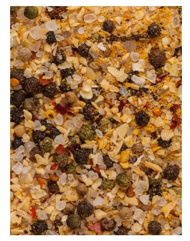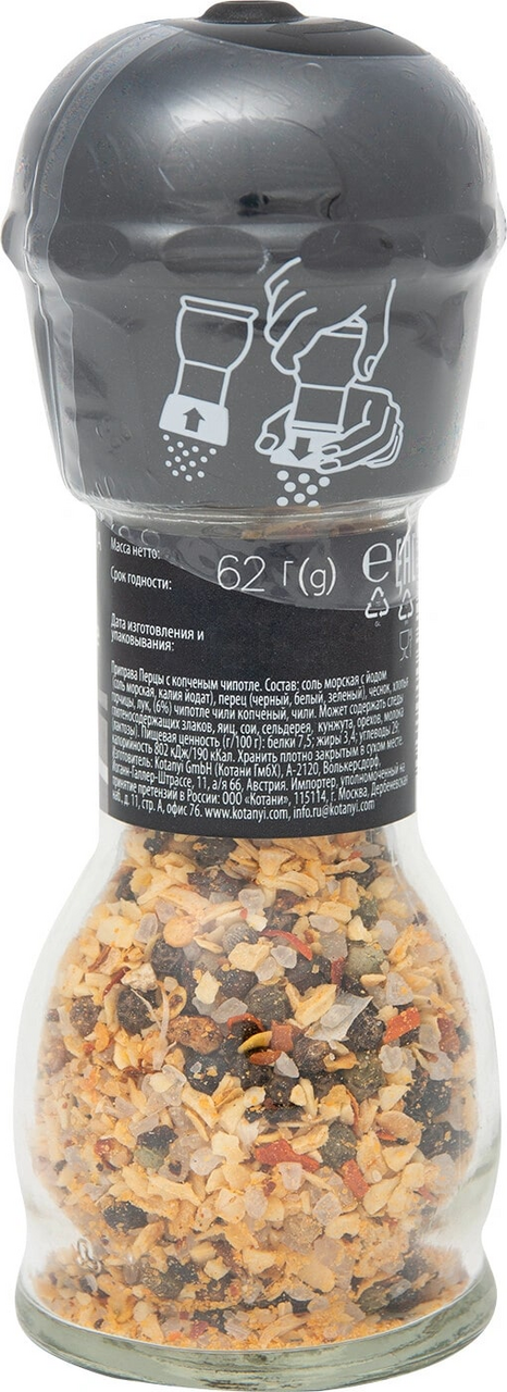 Соль морская с йодом (соль морская, калия йодат), перец (черный, белый, зеленый), чеснок, хлопья горчицы, лук, (6%), чипотле чили копченый, чили.