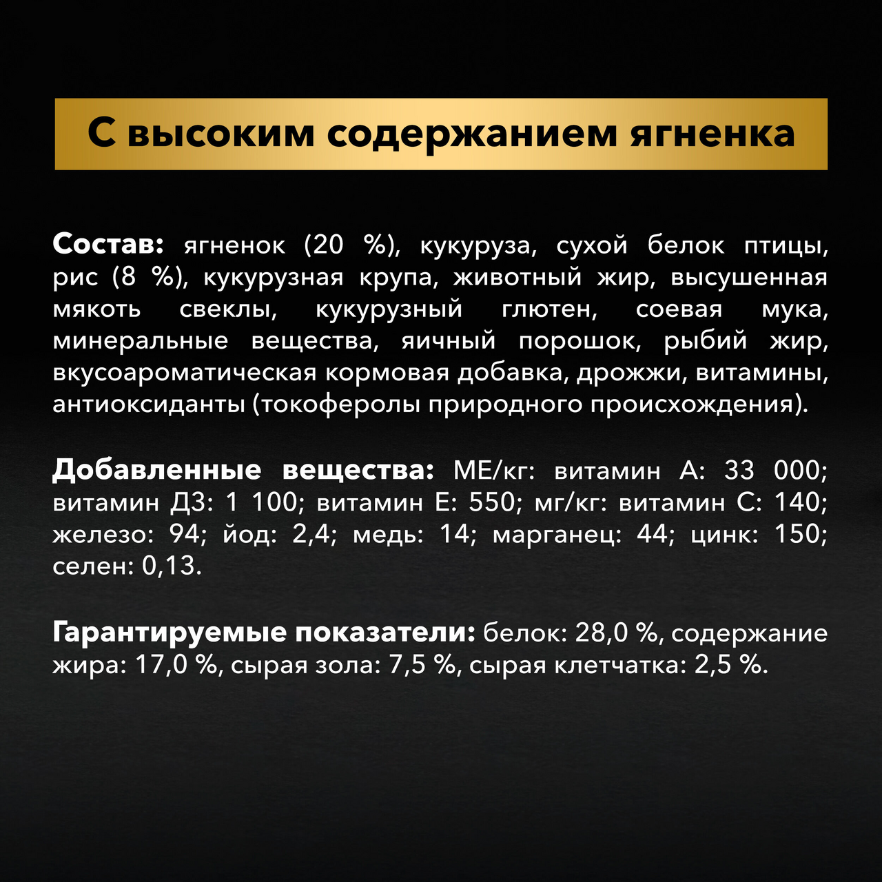 Мука из мяса ягненка (25%), рис, куриный жир (консервированный токоферолами), рисовый протеин, масло лосося, пивные дрожжи, натуральные ароматизаторы, экстракт из трав и фруктов (300 мг/кг), сушеные яблоки, минеральные вещества, глюкозамина гидрохлорид (260 мг/кг), хондроитина сульфат (160 мг/кг) мананоолигосахариды (150 мг/кг), фруктоолигосахариды (100 мг/кг), экстракт юкки шидигеры (80 мг/кг), органическая медь, органический цинк, органический селен. Аналитические составляющие: сырой протеин 24,0 %, сырой жир 10,0 %, влага 10,0 %, сырая зола 7,0 %, сырая клетчатка 2,9 %, кальций 1,6 %, фосфор 1,1 %. Пищевые добавки на 1 кг: витамин A 15 000 МЕ, витамин D3 1 500 МЕ, витамин E (α-токоферол) 500 мг, Е1 железо 80 мг, Е6 цинк 70 мг, Е5 марганец 36 мг, Е4 медь 20 мг, Е2 йод 0,65 мг, Е8 селен 0,2 мг.