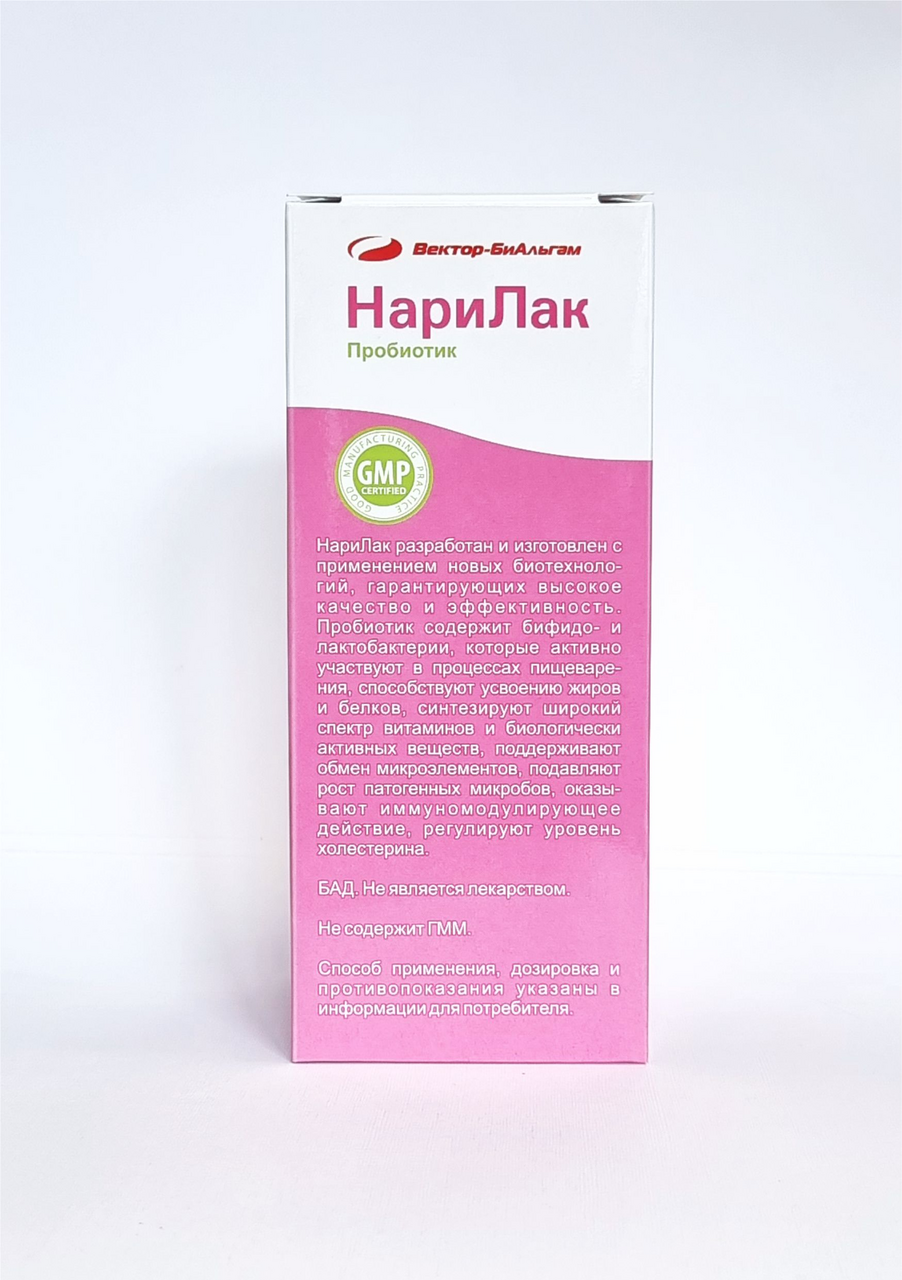 НариЛак-Форте-В - это био продукт, содержащий комплекс лакто- и бифидобактерий и предназначенный для профилактики дисбактериозов. В состав био продукта включены наиболее эффективные штаммы бифидобактерий видов B.bifidum, B.longum и лактобактерий видов L.acidophilus. В 1мл био продукта содержится не менее 10КОЕ/г лактобактерий и не менее 10 бифидобактерий.