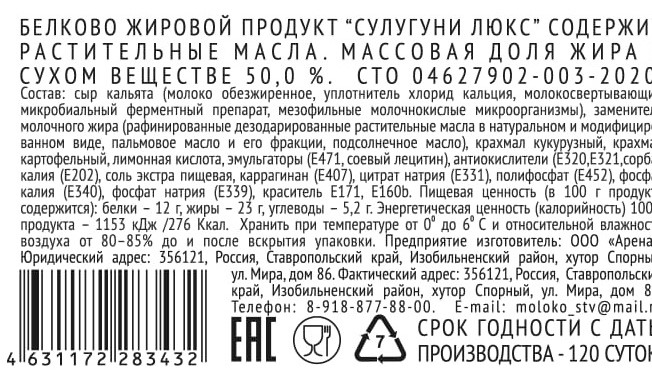 Продукт белково-жировой Арена сулугуни люкс 50%, ~500г