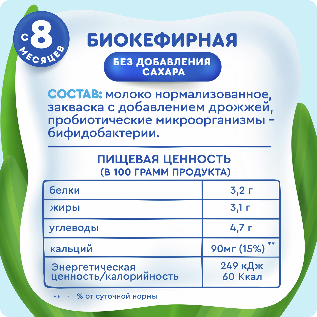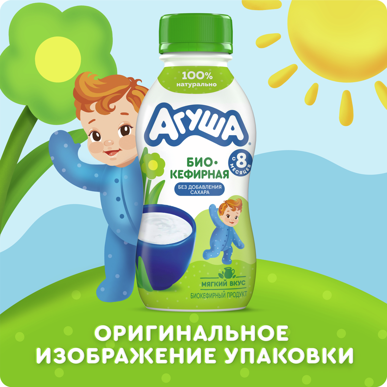 Первая детская Агуша Биокефирная - мягкий вкус и пробиотики для маленьких животиков.Новинка Агуша детская Биокефирная - это 100% натуральный кисломолочный продукт с мягким вкусом и пробиотиком для комфортного пищеварения. Этот продукт разработан специально для детского питания с 8ми месяцев. Отлично подходит для ввода в прикорм питьевых кисломолочных продуктов. Производится по инновационной рецептуре с использованием молока и многокомпонентной закваски, без добавления сахара.Детское питание Агуша Биокефирная для полезного перекуса разработано с учетом вкусовых предпочтений малышей: оно обладает мягким вкусом и более низкой кислотностью, производится из высококачественного сырья с соблюдением требований к показателям безопасности. Помимо биокефирной Агуша предлагает кисломолочную продукцию - кефир, ряженку, йогурт питьевой, творог - для расширения рациона подрастающего малыша.