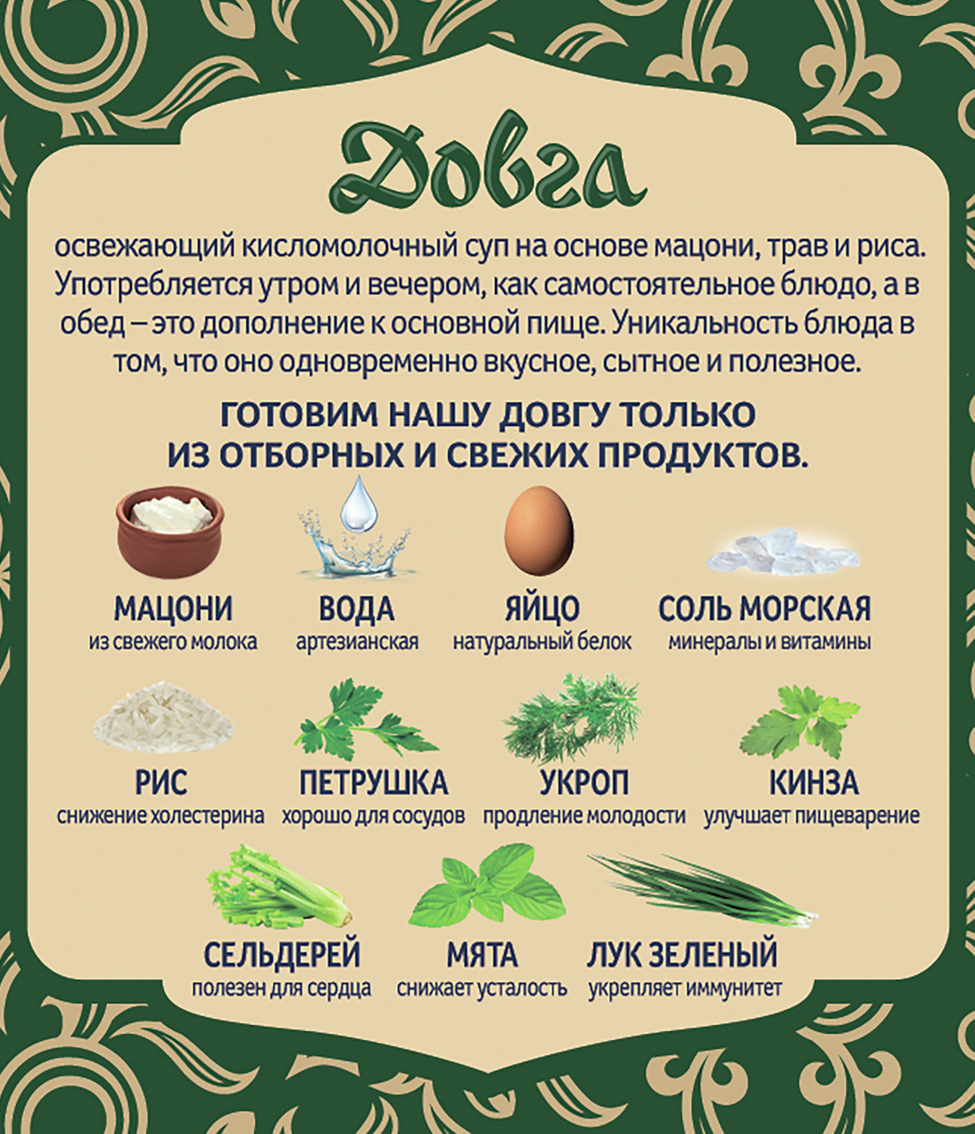 Довга с рисом и травами Долголетие — готовое блюдо азербайджанской кухни, которое утолит голод, охладит в жару и позаботится о вашем здоровье. И конечно, это просто вкусно: свежая зелень придает пикантность кисломолочной основе.