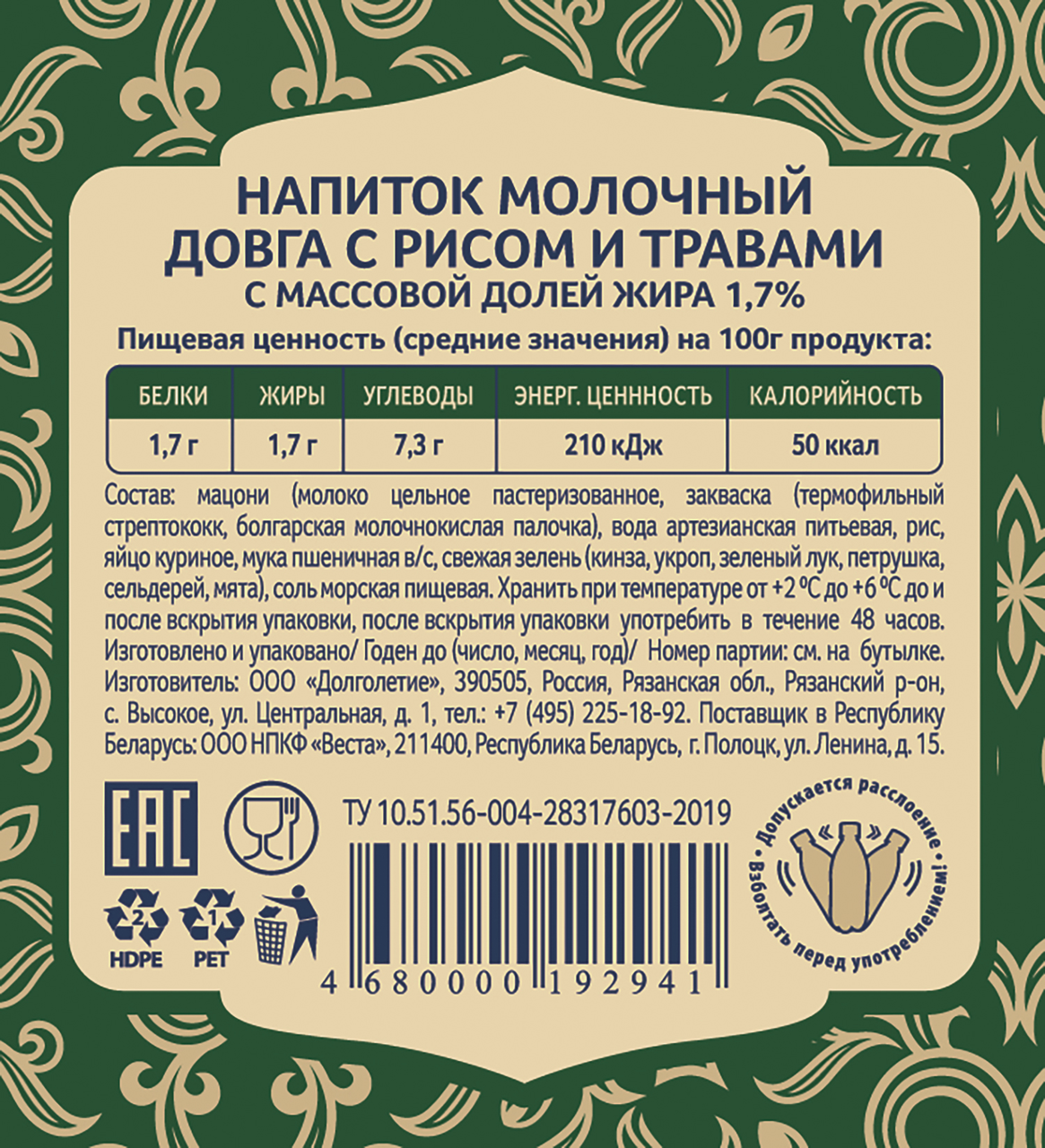 Довга Долголетие с рисом и травами 1.7%, 500г
