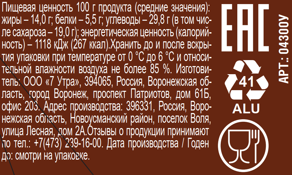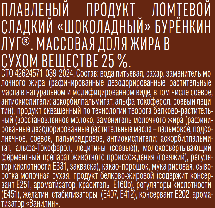 Вода питьевая, сахар, заменитель молочного жира рафинированные дезодорированные растительные масла в натуральном и модифицированном виде, в том числе соевое, антиокислители: аскорбилпальмитат, альфа-токоферол, соевый лецитин, продукт сквашенный по технологии творога белково-растительный восстановленное молоко, заменитель молочного жира рафинированные дезодорированные растительные масла - пальмовое, подсолнечное, соевое, пальмоядровое, антиокислители: аскорбилпальмитат, альфа-Токоферол, лецитины соевые, молокосвертывающий ферментный препарат животного происхождения говяжий, регулятор кислотности Е331, закваска, какао-порошок, мука рисовая, продукт белково-жировой содержит консервант Е251, ароматизатор, краситель Е160b, сыворотка молочная сухая, регуляторы кислотности Е451, желатин, стабилизаторы Е407, Е412, консервант Е202, ароматизатор Ванилин.