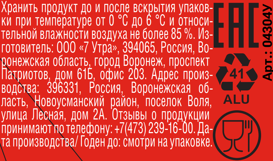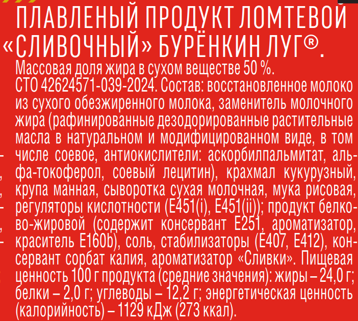 Восстановленное молоко из сухого обезжиренного молока, заменитель молочного жира рафинированные дезодорированные растительные масла в натуральном и модифицированном виде, в том числе соевое, антиокислители: аскорбилпальмитат, альфа-токоферол, соевый лецитин, крахмал кукурузный, крупа манная, сыворотка сухая молочная, мука рисовая, регуляторы кислотности Е451i, Е451ii; продукт белково-жировой содержит консервант Е251, ароматизатор, краситель Е160b, соль, стабилизаторы Е407, Е412, консервант сорбат калия, ароматизатор Сливки.