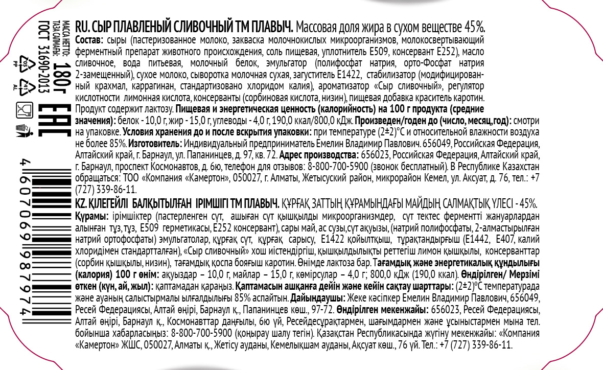 Сыры (пастеризованное молоко, закваска молочнокислых микроорганизмов, молокосвертывающий ферментный препарат животного происхождения, соль, уплотнитель хлорид кальция, консервант нитрат калия), масло сливочное, вода, молочный белок, эмульгатор (полифосфат натрия, орто-фосфат натрия 2-замещенный), сухое молоко, сыворотка молочная сухая, загуститель Е1422, соль, стабилизаторы (модифицированный крахмал, каррагинан), ароматизатор Сыр сливочный, регулятор кислотности - лимонная кислота, консерванты (сорбиновая кислота, низин), комплексная пищевая добавка (каротины, альфа-токоферол).