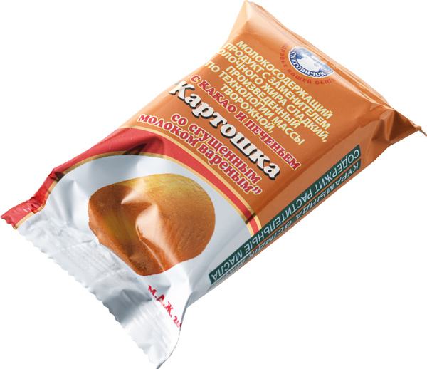 Продукт творожный Снеговичок Картошка со сгущенным молоком вареным, 90г это оригинальное сочетание классической рецептуры и любимого с детства пирожного. Он наверняка понравится детям, которых порой непросто заставить есть творог. Бисквитное печенье и шоколадная глазурь просто тают во рту.